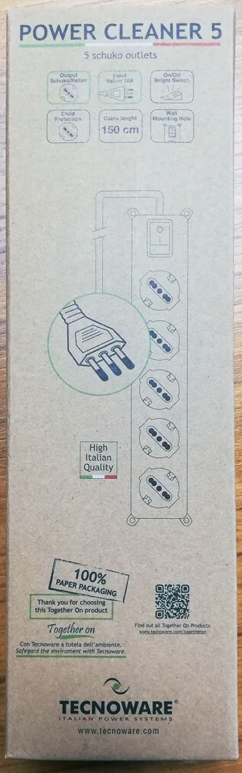 Multipresa filtrata Tecnoware "Power Cleaner 5", 5 uscite bipasso/schuko, inclinate 45°, chil protection, tasto on/off, nero